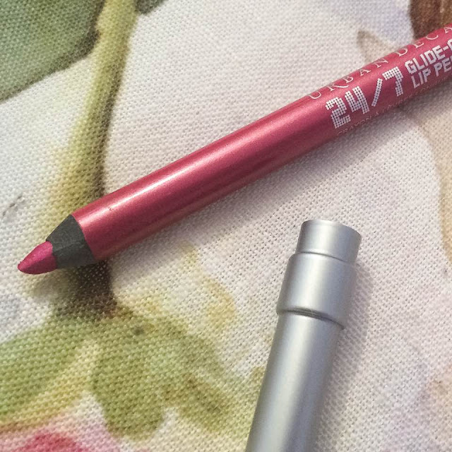 Talking about the Big Bang lipliner first. This is my first Urban Decay lipliner and I have to say I am impressed. The texture is soft and creamy, and not at all drying. The pencil just glides along my lips without any snagging or tugging. The colour of Big Bang is a bold fuchsia with just a hint of the pink glitter that the full lipstick contains. I own no other lipliner like this or as bold a this. The rest of my lipliners are all more nudey pinks so this was a definite step out of my comfort zone.